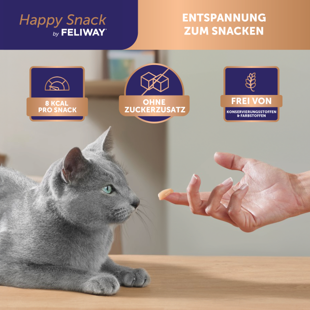 FELIWAY® HAPPY Snack ist ein Ergänzungsfuttermittel in Form eines schmackhaften, cremigen Leckerbissens für Katzen zum Lecken mit beruhigenden Eigenschaften