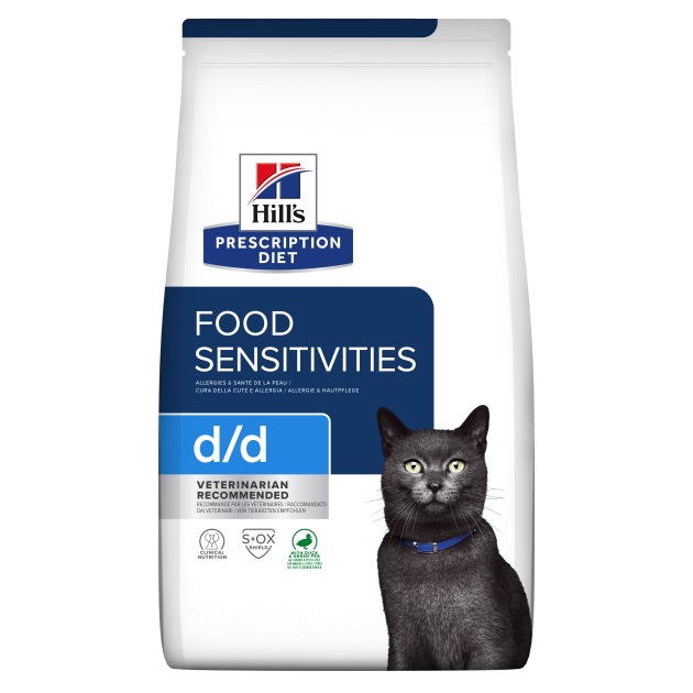 Prescription Diet Feline d/d Food Sensitivities eignet sich für Katzen mit Hautveränderungen oder Futtermittelunverträglichkeit mit dermatologischen oder gastrointestinalen Symptomen.