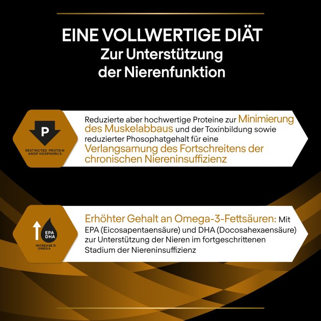 - Reduzierter Phosphorgehalt zur Verlangsamung der Progression von CNI und zur Minimierung des Risikos eines sekundären Hyperparathyreoidismus.