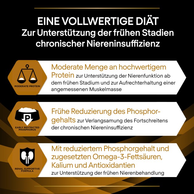 - Moderate Menge an hochwertigem Protein zur Unterstützung der Nierenfunktion ab dem frühen Stadium und zur Aufrechterhaltung einer angemessenen Muskelmasse.