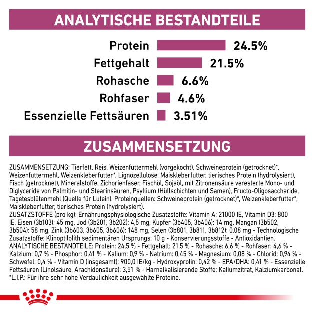 - Begrenzter Gehalt an Phosphor, Kalzium und Vitamin D.