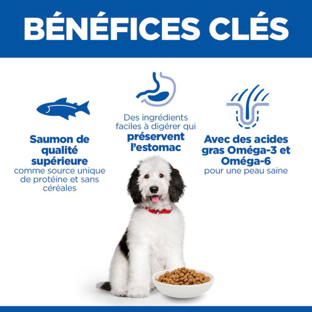 Cet aliment complet convient parfaitement aux chiens adultes ayant une peau et un estomac sensibles